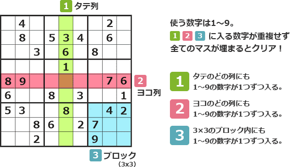 3×3のブロックで構成された9×9マスの中に、1~9までの数字を1つずつ入れていき、タテ一列、ヨコ一列、区切られた3×3のブロック内で、数字が重複しないように全てのマスを埋めよう!